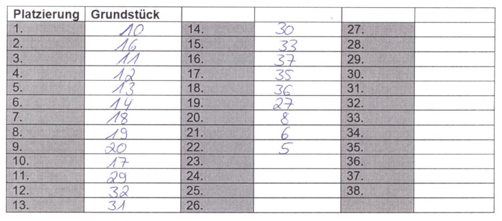 Nach Langem abwägen, welches Grundstück nehmen wir und warum haben wir heute die Bewerbung abgeschickt. Wir haben uns auf die u.s. Reihenfolge geeinigt. Einige Grundstücke fallen für uns raus, da wir nicht an der Einfahrt direkt wohnen wollen, also sind die Nummern 1-4 weg. Nummer 24, 25, 26 fallen raus, da wir da direkt an den Ecken der Einfahrtstraße bauen würden. Nummer 5, 6, 7 finden wir auch nicht so pralle….. Man ist ja schließlich „der Neue“ und baut direkt am Garten der alt eingesessenen. Nummer 9 wäre zwar toll ist aber durch die Größe von bald 800 qm unbezahlbar. Wir reden hier ja dann schon von 104.000 € und dann steht da immer noch kein Haus.